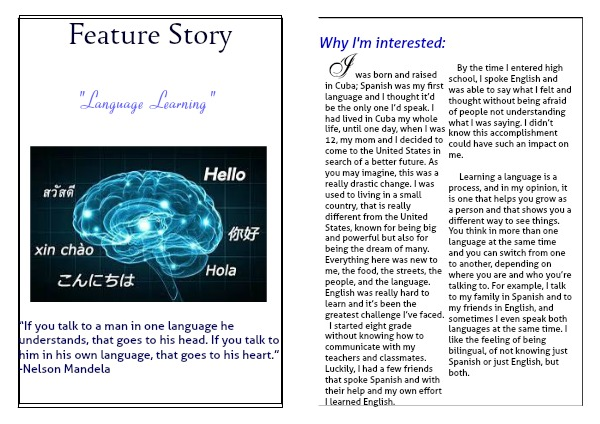 Learning a language is a process, and in my opinion, it is one that helps you grow as a person and that shows you a different way to see things. You think in more than one language at the same time and you can switch from one to another, depending on where you are and who you’re talking to. For example, I talk to my family in Spanish and to my friends in English, and sometimes I even speak both languages at the same time. I like the feeling of being bilingual, of not knowing just Spanish or just English, but both.