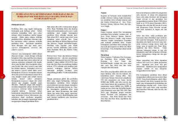 Kegiatan ini bertujuan untuk menghasilkan produk informasi tentang tingkat keterpaparan perubahan iklim terhadap tanaman padi dari kondisi klimatologis di Jawa Timur, Sulawesi Selatan, Sulawesi Barat dan Sulawesi Tengah.