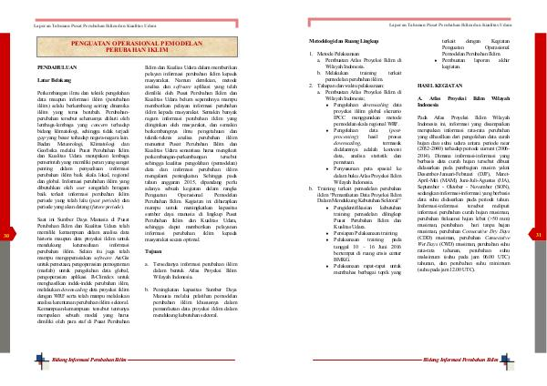 � Penyusunan peta spasial ke dalam buku Atlas Proyeksi Iklim Wilayah Indonesia. b. Training terkait pemodelan perubahan iklim ― Pemanfaatan Data Proyeksi Iklim Dalam Mendukung Kebutuhan Sektoral ‖