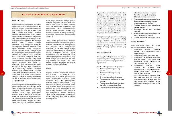 Kegiatan Pameran dan Publikasi merupakan kegiatan swakelola di bidang Pameran dan Publikasi yang ke-3 yang dilaksanakan oleh Pusat Perubahan Iklim dan Kualitas Udara BMKG melalui Sub Bidang Diseminasi Informasi Perubahan Iklim. Selama 2 tahun kegiatan ini telah dilaksanakan dengan baik yang setiap kegiatan bertemakan perubahan Iklim yang diselenggarakan oleh berbagai institusi. BMKG sebagai lembaga pemerintah yang mempunyai kewajiban menyampaikan informasi perubahan iklim kepada masyarakat sering memperoleh tawaran kerjasama berupa undangan untuk ikut berpartisipasi dalam berbagai kegiatan pameran dan publikasi terkait perubahan iklim. Kegiatan ini merupakan salah satu media diseminasi informasi yang dapat dimanfaatkan untuk memberikan penerangan kepada masyarakat luas terkait isu lingkungan seperti perubahan iklim. Selain itu kegiatan ini juga dapat dimanfaatkan untuk mendukung kegiatan diseminasi informasi yang dilakukan oleh unit kerja diluar Pusat Perubahan Iklim dan Kualitas Udara, baik yang masih berada dibawah naungan Kedeputian Bidang Klimatologi maupun di bawah naungan Kedeputian lain di lingkungan BMKG.