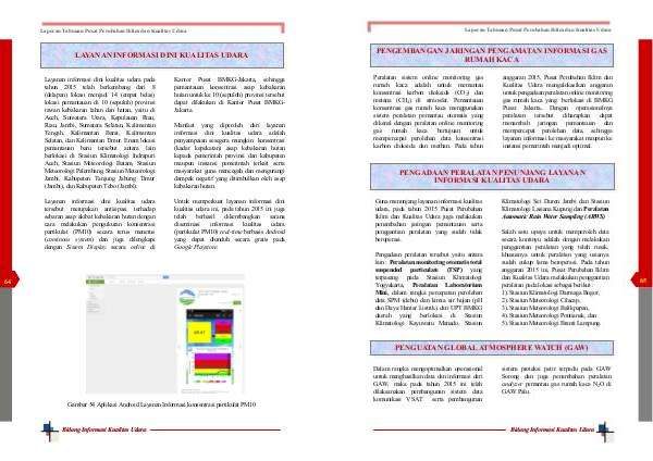 Layanan informasi dini kualitas udara pada tahun 2015 telah berkembang dari 8( delapan) lokasi menjadi 14( empat belas) lokasi pemantauan di 10( sepuluh) provinsi rawan kebakaran lahan dan hutan, yaitu di Aceh, Sumatera Utara, Kepulauan Riau, Riau, Jambi, Sumatera Selatan, Kalimantan Tengah, Kalimantan Barat, Kalimantan Selatan, dan Kalimantan Timur. Enam lokasi pemantauan baru tersebut antara lain berlokasi di Stasiun Klimatologi Indrapuri Aceh, Stasiun Meteorologi Batam, Stasiun Meteorologi Palembang, Stasiun Meteorologi Jambi, Kabupaten Tanjung Jabung Timur( Jambi), dan Kabupaten Tebo( Jambi).