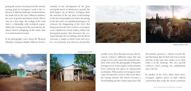 Between borders, 2009 notable worry about that phenomenon, the document evidences additional stages that may escape us if we only tend to the eminently anecdotic of his work. The photographs of Alejandro Cartagena focus in the registry of discontinuity from evidencing lost spaces of superposition mechanisms. What matters in Cartagena’ s landscape / documentary work is what is not there: the missing element. The absence becomes a formal finding, but also violent expressions. The discontinuity generates a subtext towards the anti-functional, that of which only traces remain and that, at the same time, makes us see what really is in the landscape. The city’ s growth evidences what’ s missing, the uninhabitable space: the lost.