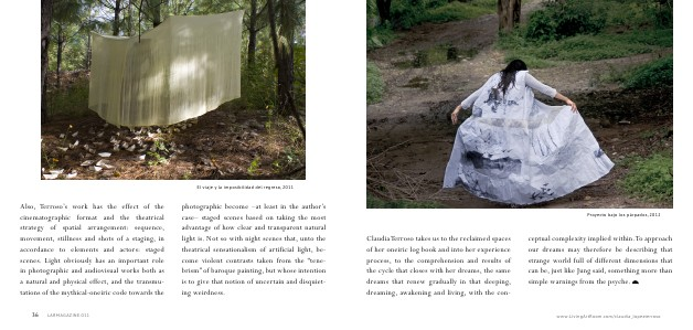 Also, Terroso’ s work has the effect of the cinematographic format and the theatrical strategy of spatial arrangement: sequence, movement, stillness and shots of a staging, in accordance to elements and actors: staged scenes. Light obviously has an important role in photographic and audiovisual works both as a natural and physical effect, and the transmutations of the mythical-oneiric code towards the photographic become – at least in the author’ s case – staged scenes based on taking the most advantage of how clear and transparent natural light is. Not so with night scenes that, unto the theatrical sensationalism of artificial light, become violent contrasts taken from the“ tenebrism” of baroque painting, but whose intention is to give that notion of uncertain and disquieting weirdness.