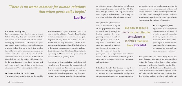 I. A never ending story Few photographs stay fixed in our memory. When they do, they are powerful symbols, sometimes by imposition and others, spontaneously, by communion. That may be the yearned place a photographer wants for his images, a photographer that has a hard time sending into oblivion what he considers memorable for everyone else. But how to leave a mark on the collective conscience of societies that have been exceeded not only by images of brutality, but by the same facts that cause them, and that look to be overcome by the victims to survive their circumstances? That is the subject of this text.