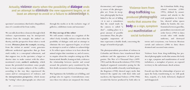 Violence born from drug-trafficking has produced photographic works that assume the body as a sign, symptom and manifestation of social turbulence the Colombian fields; drugrelated terrorism( 1984- 1993), defined by assassinations and attacks to the civil population in Colombia, showed urban spaces shaken by bombs; the confrontation between guerillas, paramilitary movements and order forces( 1964 to date) reveals sides with similar uniforms, and destroyed towns and ecosystems; war between Mexican cartels and enforcers( 2006 to date) shows detained and executed state armies.