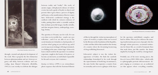 The question is if beauty can do it all, if it can even show us its terrible face – maybe our own reflection –, and if we are able to see it. The social situation in Colombia is a hard paradox: if you hear what’ s going on you will rise up, and if you rise up you are in danger of being terminated, or of falling in the same violent logic. Echeverría leaves a hard work for the spectator: to continue expectant, caught in the beauty of its pieces, or become an interactor, an individual responsible for his and everyone else’ s existence.