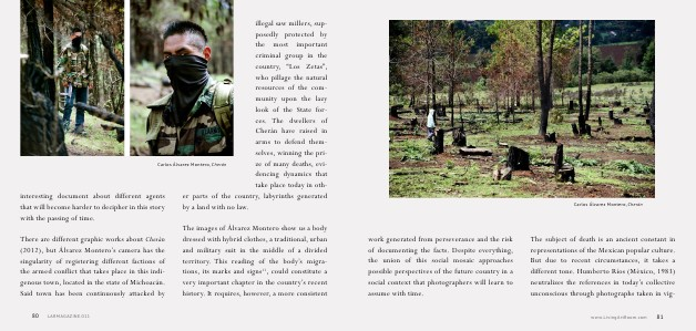There are different graphic works about Cherán( 2012), but Álvarez Montero’ s camera has the singularity of registering different factions of the armed conflict that takes place in this indigenous town, located in the state of Michoacán. Said town has been continuously attacked by illegal saw millers, supposedly protected by the most important criminal group in the country,“ Los Zetas”, who pillage the natural resources of the community upon the lazy look of the State forces. The dwellers of Cherán have raised in arms to defend themselves, winning the prize of many deaths, evidencing dynamics that take place today in other parts of the country, labyrinths generated by a land with no law.