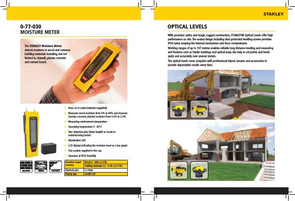 With precision optics and tough , rugged construction , STANLEY ® Optical Levels offer high performance on site . The sealed design including dust protected levelling screws provides IP54 rated , keeping the internal mechanism safe from contaminants . Working ranges of up to 107 metres enables reliable long distance leveling and measuring and features such as Stadia markings and optical peep site help to set points and levels quick and accurately over uneven terrain . The optical levels come complete with professional tripod , mounts and accessories to provide dependable results every time .
