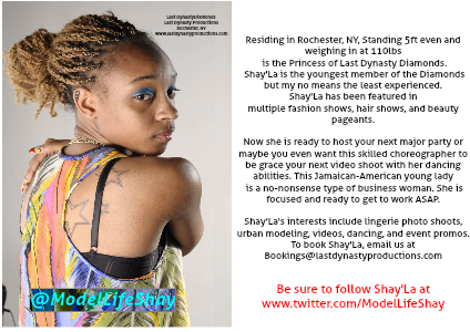 Shay'La's interests include lingerie photo shoots, urban modeling, videos, dancing, and event promos.