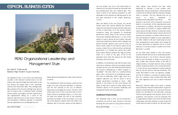 In addition, the leadership style that Peruvians had, which was a reflection of the one during the Spanish conquest period, up to the following periods before the country’ s independence is called“ caudillo” or“ caudillaje”. This style refers to a political-military leader who is the head of an authoritarian power. This type of leadership, which might seem as a negative approach, can still be found in Peru’ s modern government according to many. Both periods in the history of Peru have become the pillars of what Peru’ s society is today. Modern Peru combines aspects of the previous leadership and management styles with new approaches.