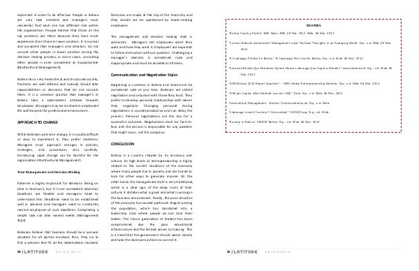 important in order to be effective. People in Bolivia are very task oriented and managers must remember that each one has different role within the organization. People believe that those at the top positions are there because they have more experience than those in lower position. It is normal and accepted that managers and directors do not consult other people in lower position during the decision making process; in some cases, consulting other people is even considered as inappropriate( Multicultural Management).