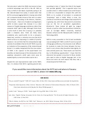 The only area in which the TOEFL test seems to have a distinct advantage over IELTS is the iBT. With as many as 96 % of test-takers reportedly opting to do the internet-based test( Labi), it would seem that IELTS is seriously lagging behind in having only rolled out a computer-based version of the test in a select few locations. According to Ms Meiron, however, " we ' ve found … that a lot of students and applicants prefer to take a paper test, because it is a clear measure of English-language proficiency rather than computer skills "( qtd in Labi). Although I think there is some truth in what she is saying, it is probably quite a simplistic view. There are likely many candidates who would prefer to do a computerbased test, and this is certainly one area that IELTS needs to focus on improving as a matter of priority. However, I do not think that the extraordinarily high number of candidates that do the iBT TOEFL is purely an indication of the popularity of the internet-based format. It is widely recognized that the new version of TOEFL is far superior to the paper-based one( Jaschik), not least because of the introduction of the speaking component, which goes some ways to explaining why so many test-takers opt to do it.