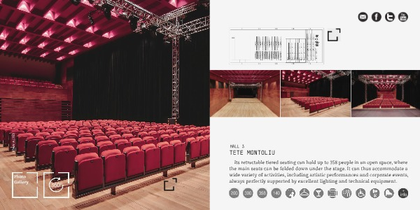 Its retractable tiered seating can hold up to 358 people in an open space, where the main seats can be folded down under the stage. It can thus accommodate a wide variety of activities, including artistic performances and corporate events, always perfectly supported by excellent lighting and technical equipment.