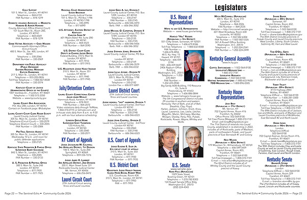 Josh Bray( Republican— 71st District) Mt. Vernon, KY 702 Capitol Annex, Room 416 Frankfort, Ky 40602 Office Phone: 502-564-8100 Toll Free Phone( Message) 1-800-372-7181 Email: josh. bray @ kylegislature. gov The 71st District of extends into Laurel County, established in re-districting in 2022, includes all of Rockcastle, parts of Madison, parts of northeastern Pulaski, and Laurel precincts of East Bernstadt # 1 and Colony.