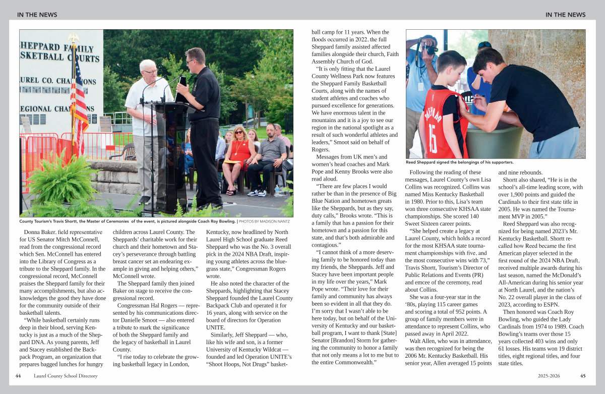 “ It is only fitting that the Laurel County Wellness Park now features the Sheppard Family Basketball Courts, along with the names of student athletes and coaches who pursued excellence for generations. We have enormous talent in the mountains and it is a joy to see our region in the national spotlight as a result of such wonderful athletes and leaders,” Smoot said on behalf of Rogers.