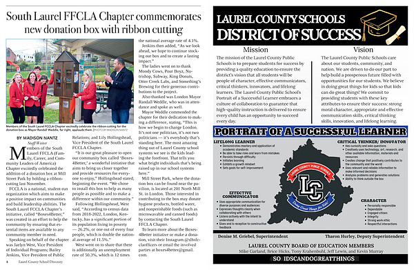 Mission The mission of the Laurel County Public Schools is to prepare students for success by providing a quality education to ensure the district’ s vision that all students will be people of character, effective communicators, critical thinkers, innovators, and lifelong learners. The Laurel County Public School’ s Portrait of a Successful Learner embraces a culture of collaboration to guarantee that high-quality instruction is delivered to ensure every child has an opportunity to succeed every day.