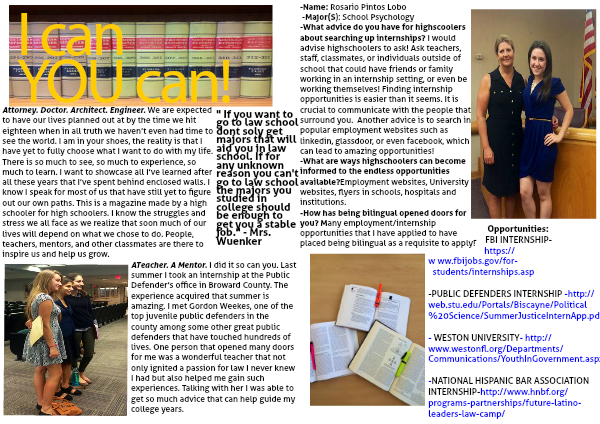 -What advice do you have for highscoolers about searching up internships? I would advise highschoolers to ask! Ask teachers, staff, classmates, or individuals outside of school that could have friends or family working in an internship setting, or even be working themselves! Finding internship opportunities is easier than it seems. It is crucial to communicate with the people that surround you. Another advice is to search in popular employment websites such as linkedin, glassdoor, or even facebook, which can lead to amazing opportunities!