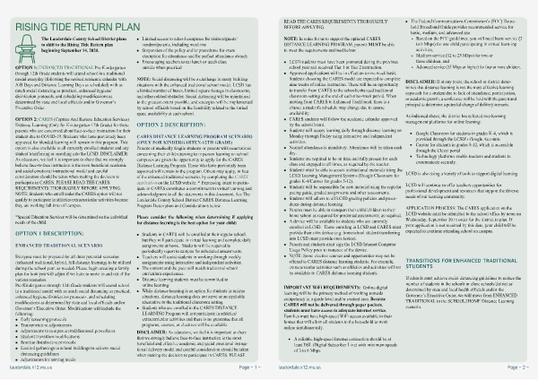 OPTION 2 : CARES ( Capture And Restore Education Services ) Distance Learning ( Only for Kindergarten-12th Grade ) for those parents who are concerned about face-to-face instruction for their student due to COVID-19 . Students who have previously been approved for blended learning will remain in this program . This option is also available to all currently enrolled students and any student transferring or enrolling into the LCSD . DISCLAIMER : As educators , we feel it is important to share that we strongly believe face-to-face instruction is the most beneficial academic and social emotional instructional model and careful consideration should be taken when making the decision to participate in CARES . PLEASE READ THE CARES REQUIREMENTS THOROUGHLY BEFORE APPLYING . NOTE : Students who enroll under the CARES option will not qualify to participate in athletics / extracurricular activities because they are working full time off campus .