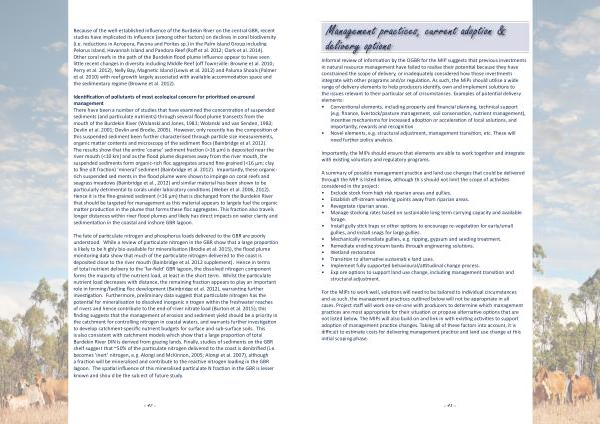 Identification of pollutants of most ecological concern for prioritised on-ground management There have been a number of studies that have examined the concentration of suspended sediments ( and particulate nutrients ) through several flood plume transects from the mouth of the Burdekin River ( Wolanski and Jones , 1981 ; Wolanski and van Senden , 1983 ; Devlin et al . 2001 ; Devlin and Brodie , 2005 ). However , only recently has the composition of this suspended sediment been further characterised through particle size measurements , organic matter contents and microscopy of the sediment flocs ( Bainbridge et al . 2012 ). The results show that the entire ‘ coarse ’ sediment fraction (> 16 µ m ) is deposited near the river mouth (< 10 km ) and as the flood plume disperses away from the river mouth , the suspended sediments form organic-rich floc aggregates around fine-grained (< 16 µ m ; clay to fine silt fraction ) ‘ mineral ’ sediment ( Bainbridge et al . 2012 ). Importantly , these organicrich suspended sediments in the flood plume were shown to impinge on coral reefs and seagrass meadows ( Bainbridge et al ., 2012 ) and similar material has been shown to be particularly detrimental to corals under laboratory conditions ( Weber et al . 2006 , 2012 ). Hence it is the fine-grained sediment (< 16 µ m ) that is discharged from the Burdekin River that should be targeted for management as this material appears to largely fuel the organic matter production in the plume that forms these floc aggregates . This fraction also travels longer distances within river flood plumes and likely has direct impacts on water clarity and sedimentation in the coastal and inshore GBR lagoon .