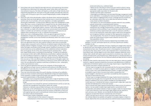 -The best way to manage the risks associated with the first wet season following intervention . Is it better to invest upfront in irrigation and fertiliser application to ensure a cover crop is well established before October , or might it be better to establish a type of storm insurance fund , where a proportion of all project budgets is diverted into a pool that is accessible by other projects in the event of destructive first rains . -The best way to manage / rehabilitate the range of gully-channel connections , as distinct from the gully areas more generally . This may involve numerical and physical modelling of the various options available for reconfiguring this crucial nexus ( e . g . a hardened slot canyon compared with a large open swale that will alter the hydrodynamics of the trunk stream ). -Rules of thumb that relate material characteristics to likely success of treatment options . Can we predict a stable slope angle based on assessment of soil characteristics and optimal selection of types of organic matter for topsoil design , or will a time-intensive ( 1 year plus ) slope angle stability test be required in each and every case . Likewise , can we identify the effective depth of gypsum incorporation based on standard low cost soil tests ? -What is the best way to monitor current and future export rates ? How do the methods likely to be available and applied in a broader program compare to results obtained by more accurate and precise methods based on ground-based