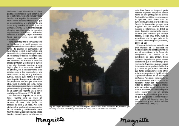 interpretarlo. La técnica y el significado de esta pintura tiene bastante importancia, pues ambas cosas hacen que la obra obtenga gran relevancia. El hecho de que sea surreal la hace aún más importante, la técnica y la forma en que plasmó todo hace que tanto espectadores como otros artistas se pregunten el significado de la pintura y entren en un estado de confusión. Para poder comprender lo surreal de la obra y de la colección es necesario mirar con detenimiento todas las pinturas, porque a simple vista no todos logran distinguir lo surreal. Con esta obra René Magritte logró convertirse en un artista referente del surrealismo, pero antes de que esto pasará él jamás imaginó que tendría tal impacto ante los espectadores y en ciertos artistas (García-Bernejo, 1994; 15).