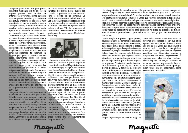 Magritte pintó esta obra pensando en el público al que esta obra podría ser dirigida, pues como siempre, tenía un mensaje que dar, pero en ninguna de sus obras es sencillo el descifrar dicho mensaje. El rostro no se repliega sobre sí ya que esta tapado. El cielo está abierto hacia el espacio, sin nada que se interponga. Lo velado deja de ser algo visible, circunstancialmente, otro algo lo oculta. Lo invisible es así la suspensión de lo visible. Por lo que de cierta forma lo visible puede ser ocultado, pero lo invisible no oculta nada; puede ser conocido o ignorado, nada más que eso. Pero lo oculto no es invisible. Es visibilidad suspendida. Lo invisible, a su vez, al ser lo visible suspendido no oculta nada, no encumbre un espacio sustraído a todo acto de visión. Este proceso no lo entiende el ojo. Sólo lo comprende el pensamiento. Esta obra de cierta forma yuxtapone de varias cosas (Castañeda, 2009; 53).