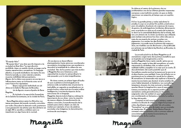 La escuela pictórica de Rene Maggritte es el surrealismo surgió tanto de la pintura metafísica que se inspiraba en la imaginación y en los sueños.Maggritte tiene razón cuando opina que es factible que, según la idea del surrealismo, el sueño represente la verdadera vida, se refiere que la realidad visible y tangible no es más que un sueño. El descubrimiento del sueño permitió que el Surrealismo puede resolver la manera en la que se ve el alma frente a una realidad. Como de la Dada con su persistencia en la ordenación casual de los objetos. Al surrealismo le interesaba más explorar e ilustrar la mente inconsciente que destruir el arte establecido, como había intentado el dadaísmo. Los surrealistas intentaron el punto de vista racional y científico, querían liberar la imaginación y que el espectador tomara conciencias de su aspecto poético. El surrealismo actúa generalmente por inversión, asignando valor de verdad a lo que hasta entonces era considerando un fantasma y dándole la vuelta a la idea del mundo.