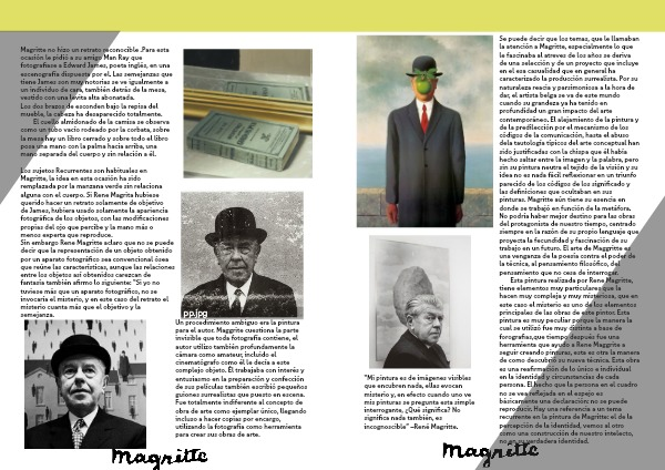 Sin embargo Rene Magritte aclaro que no se puede decir que la representación de un objeto obtenido por un aparato fotográfico sea convencional ósea que reúne las características, aunque las relaciones entre los objetos así obtenidos carezcan de fantasía también afirmo lo siguiente: “Si yo no tuviese más que un aparato fotográfico, no se invocaría el misterio, y en este caso del retrato el misterio cuanta más que el objetivo y la semejanza.