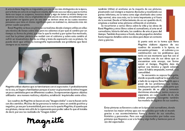 Se recurrieron a varios libros sobre la vida y las obras de René Magritte y otros libros sobre el surrealismo, el arte en el surrealismo, historia del arte, los cambios de arte al paso del tiempo. También buscamos a fondo, desde pequeños detalles hasta mayores detalles sobre sus obras para dejar un contexto claro y preciso.