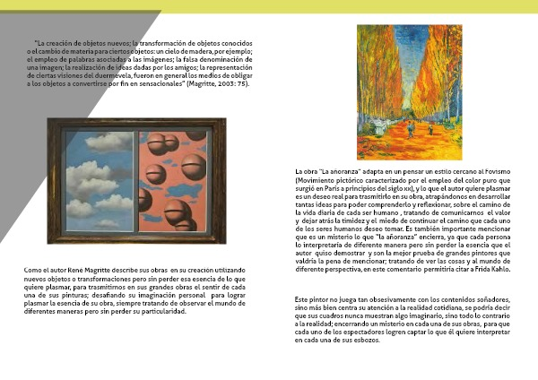 Como el autor René Magritte describe sus obras en su creación utilizando nuevos objetos o transformaciones pero sin perder esa esencia de lo que quiere plasmar, para trasmitirnos en sus grandes obras el sentir de cada una de sus pinturas; desafiando su imaginación personal para lograr plasmar la esencia de su obra, siempre tratando de observar el mundo de diferentes maneras pero sin perder su particularidad.