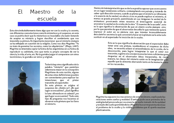 Dentro de la interpretación que se daría se podría suponer que se encuentra en un lugar totalmente solitario, contemplando ese paisaje y tratando de saber qué dirección tomara, cuando se piensa que el misterio es inherente a la esencia de la verdad, en efecto si no se puede explicar el misterio, al menos se puede presentir, permitiendo en sus imágenes la verdad de lo misterioso provocando entre nosotros el interrogante esencial de encontrar la verdad en lo oculto de la obra “ El maestro de la escuela”; esto es lo que significa la observación de que un objeto oculta siempre otro; por lo que permite de que el observador describa lo que realmente quiere expresar el autor en su pintura; más que intentar incansablemente descubrir los secretos lo que convendría hacer en la pintura sería ante todo sustituir en el espectador la intuición de lo oculto.