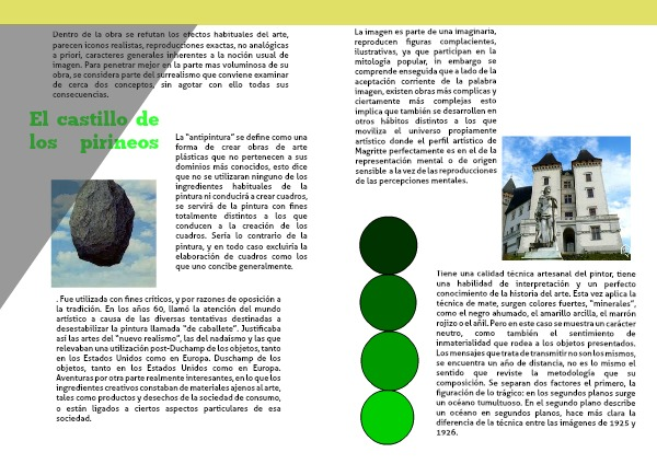 Dentro de la obra se refutan los efectos habituales del arte, parecen iconos realistas, reproducciones exactas, no analógicas a priori, caracteres generales inherentes a la noción usual de imagen. Para penetrar mejor en la parte mas voluminosa de su obra, se considera parte del surrealismo que conviene examinar de cerca dos conceptos, sin agotar con ello todas sus consecuencias.