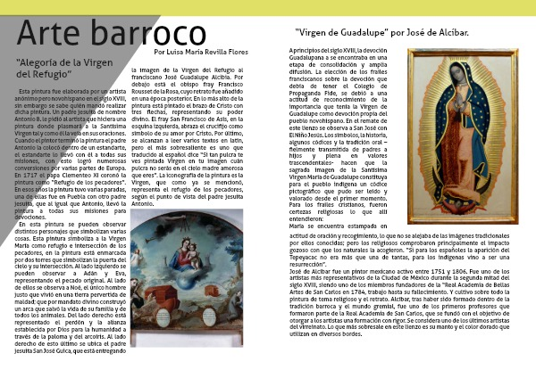 En esta pintura se pueden observar distintos personajes que simbolizan varias cosas. Esta pintura simboliza a la Virgen María como refugio e intersección de los pecadores, en la pintura está enmarcada por dos torres que simbolizan la puerta del cielo y su intersección. Al lado izquierdo se pueden observar a Adán y Eva, representando el pecado original. Al lado de ellos se observa a Noé, el único hombre justo que vivió en una tierra pervertida de maldad; que por mandato divino construyó un arca que salvó la vida de su familia y de todos los animales. Del lado derecho está representado el perdón y la alianza establecida por Dios para la humanidad a través de la paloma y del arcoíris. Al lado derecho de esto último se ubica el padre jesuita San José Guica, que está entregando la imagen de la Virgen del Refugio al franciscano José Guadalupe Alcibia. Por debajo está el obispo fray Francisco Rousset de la Rosa, cuyo retrato fue añadido en una época posterior. En lo más alto de la pintura está pintado el brazo de Cristo con tres flechas, representando su poder divino. El fray San Francisco de Asís, en la esquina izquierda, abraza el crucifijo como símbolo de su amor por Cristo. Por último, se alcanzan a leer varios textos en latín, pero el más sobresaliente es uno que traducido al español dice “Si tan pulcra te ves pintada Virgen en tu imagen cuán pulcra no serás en el cielo madre amorosa que eres”. La iconografía de la pintura es la Virgen, que como ya se mencionó, representa el refugio de los pecadores, según el punto de vista del padre jesuita Antonio.