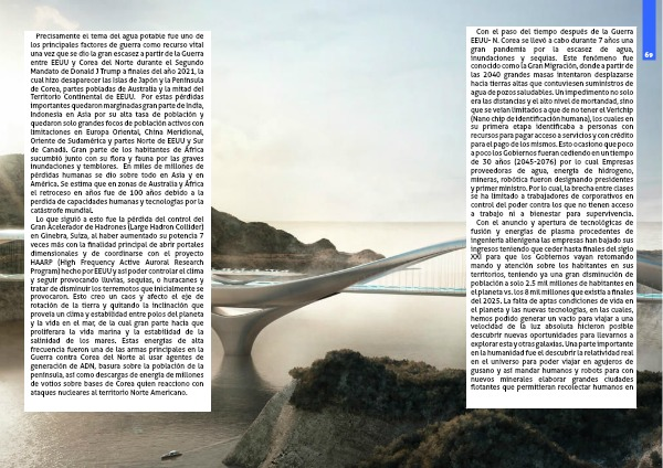 Precisamente el tema del agua potable fue uno de los principales factores de guerra como recurso vital una vez que se dio la gran escasez a partir de la Guerra entre EEUU y Corea del Norte durante el Segundo Mandato de Donald J Trump a finales del año 2021, la cual hizo desaparecer las Islas de Japón y la Península de Corea, partes pobladas de Australia y la mitad del Territorio Continental de EEUU. Por estas pérdidas importantes quedaron marginadas gran parte de India, Indonesia en Asia por su alta tasa de población y quedaron solo grandes focos de población activos con limitaciones en Europa Oriental, China Meridional, Oriente de Sudamérica y partes Norte de EEUU y Sur de Canadá. Gran parte de los habitantes de África sucumbió junto con su flora y fauna por las graves inundaciones y temblores. En miles de millones de pérdidas humanas se dio sobre todo en Asia y en América. Se estima que en zonas de Australia y África el retroceso en años fue de 100 años debido a la perdida de capacidades humanas y tecnologías por la catástrofe mundial.