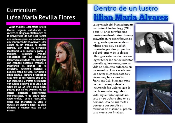A A sus 35 años, Luisa María Revilla Flores, seguirá estudiando su carrera en cirugía cardiotoracica en la universidad de San Luis Potosí, una de las mejores en todo México en cuanto a medicina. A su vez, Luisa estará en un trabajo de medio tiempo. Con todo su esfuerzo, mantendrá a su madre y padre, y también, realizará grandes donaciones con sus ganancias. Mientras realiza todo esto, trabajará con grandes doctores, creando e innovando el mundo de la medicina, haciendo mejoras a nuestro estilo de vida. Por último, Luisa Revilla, seguirá practicando cada uno de los valores que se la han inculcado, y tratará de siempre ver el lado positivo de la vida. A lo largo de sus 35 años, Luisa habrá pasado por varios eventos, de los cuales obtendrá experiencias inmemorables, y de entre estas experiencias, donde descubrirá cosas que marcarán su vida, y tratará de siempre hacer el bien, siempre y cuando esté en sus manos.