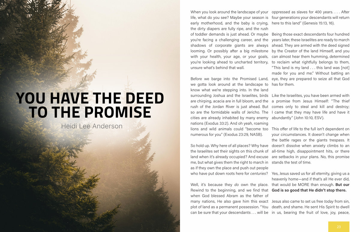 Before we barge into the Promised Land, we gotta look around at the landscape to know what we’ re stepping into. In the land surrounding Joshua and the Israelites, birds are chirping, acacia are in full bloom, and the rush of the Jordan River is just ahead. But so are the formidable walls of Jericho. The cities are already inhabited by many enemy nations( Exodus 33:2). And oh yeah, roaming lions and wild animals could“ become too numerous for you”( Exodus 23:29, NASB).