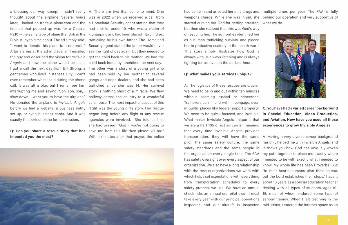 A: There are two that come to mind. One was in 2022 when we received a call from a Homeland Security agent stating that they had a child, under 10, who was a victim of kidnapping and had been placed into child sex trafficking by his own father. The Homeland Security agent stated the father would never see the light of day again, but they needed to get the child back to his mother. We had the child back home by lunchtime the next day. The other was a story of a young girl who had been sold by her mother to several gangs and dope dealers, and she had been trafficked since she was 14. Her survival story is nothing short of a miracle. We flew halfway across the country to a wonderful safe house. The most impactful aspect of this flight was the young girl’ s story. Her rescue began long before any flight or any rescue agencies were involved. She told us that she had prayed:“ God if you ' re not going to save me from this life then please kill me.” Within minutes after that prayer, the police