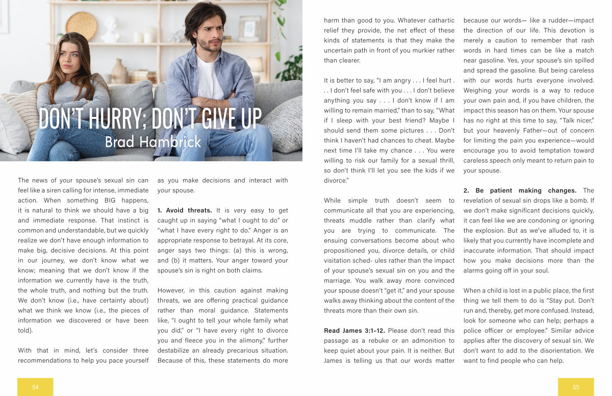 Read James 3:1 – 12. Please don’ t read this passage as a rebuke or an admonition to keep quiet about your pain. It is neither. But James is telling us that our words matter because our words— like a rudder— impact the direction of our life. This devotion is merely a caution to remember that rash words in hard times can be like a match near gasoline. Yes, your spouse’ s sin spilled and spread the gasoline. But being careless with our words hurts everyone involved. Weighing your words is a way to reduce your own pain and, if you have children, the impact this season has on them. Your spouse has no right at this time to say,“ Talk nicer,” but your heavenly Father— out of concern for limiting the pain you experience— would encourage you to avoid temptation toward careless speech only meant to return pain to your spouse.
