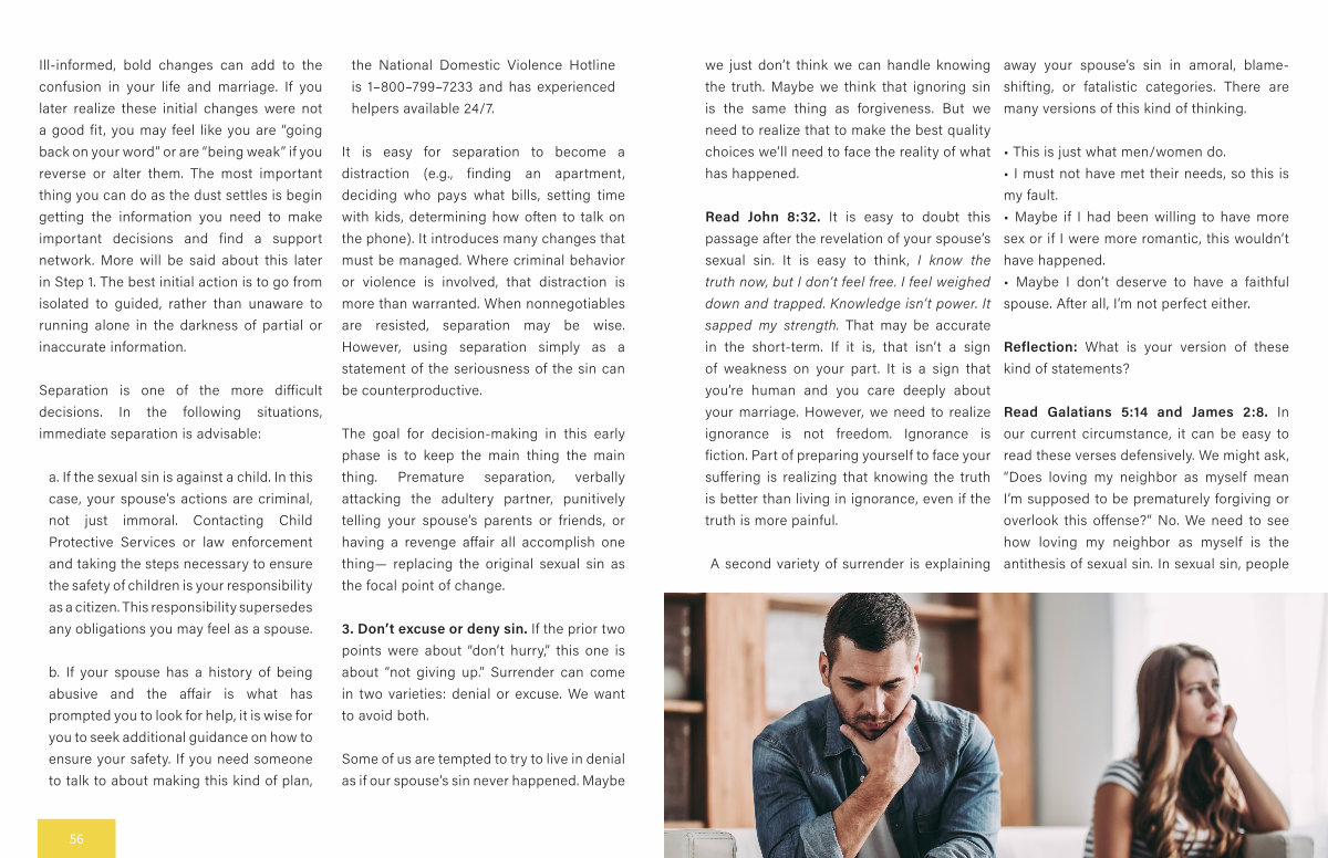 Ill-informed, bold changes can add to the confusion in your life and marriage. If you later realize these initial changes were not a good fit, you may feel like you are“ going back on your word” or are“ being weak” if you reverse or alter them. The most important thing you can do as the dust settles is begin getting the information you need to make important decisions and find a support network. More will be said about this later in Step 1. The best initial action is to go from isolated to guided, rather than unaware to running alone in the darkness of partial or inaccurate information.