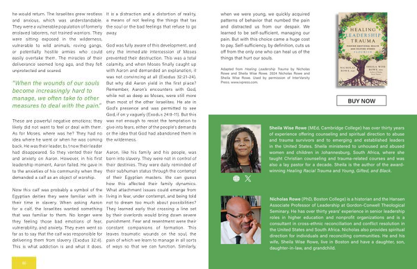 Aaron , like his family and his people , was born into slavery . They were not in control of their destinies . They were daily reminded of their subhuman status through the contempt of their Egyptian masters . We can guess how this affected their family dynamics . What attachment issues could emerge from living in fear , under contempt , and being told not to dream too much about possibilities ? They learned early that crossing a line set by their overlords would bring down severe punishment . Fear and resentment were their constant companions of formation . This leaves traumatic wounds on the soul , the pain of which we learn to manage in all sorts of ways so that we can function . Similarly ,
