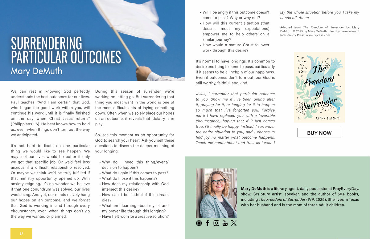 Mary DeMuth is a literary agent, daily podcaster at PrayEveryDay. show, Scripture artist, speaker, and the author of 50 + books, including The Freedom of Surrender( IVP, 2025). She lives in Texas with her husband and is the mom of three adult children. 19