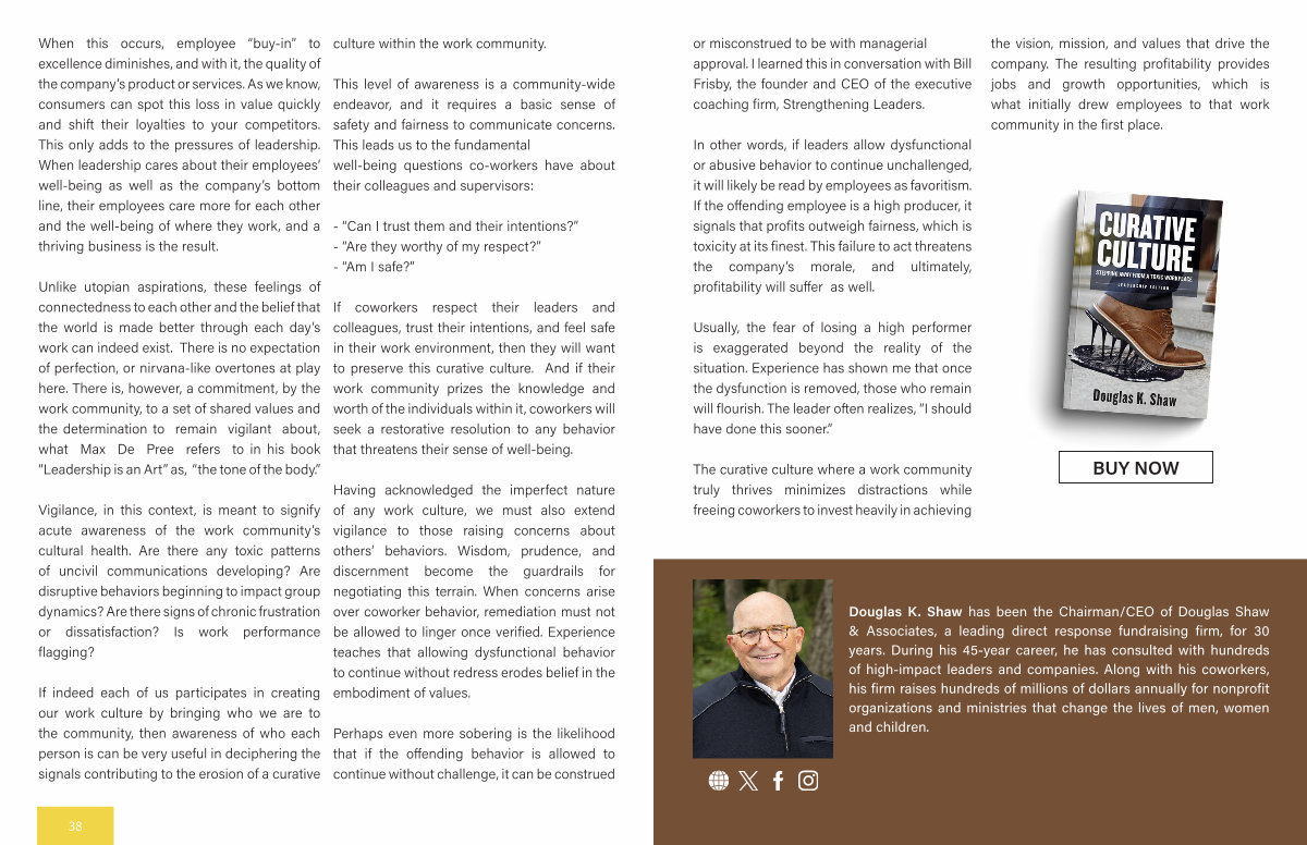 In other words, if leaders allow dysfunctional or abusive behavior to continue unchallenged, it will likely be read by employees as favoritism. If the offending employee is a high producer, it signals that profits outweigh fairness, which is toxicity at its finest. This failure to act threatens the company’ s morale, and ultimately, profitability will suffer as well. the vision, mission, and values that drive the company. The resulting profitability provides jobs and growth opportunities, which is what initially drew employees to that work community in the first place.