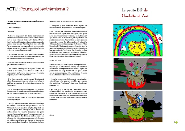 - Oh, tu sais l’Amérique n’est pas un cas isolé ! En Europe aussi de nombreux politiciens et électeurs ont des idées comparables à celles de Trump.