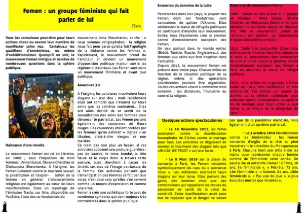 • Le 8 Mars 2019 sur la place de la concorde à Paris, les Femen nettoient symboliquement les rues du « patriarcat virus ». Les militantes inscrivent leurs slogans sur leur torse. Elles portent des gants, des lunettes ainsi que des combinaisons qui rappellent les tenues du personnel de santé de la crise du covid-19. Cette manifestation avait pour but de rappeler que le danger ne venait pas que de la pandémie mondiale, mais également d’un système patriarcal.