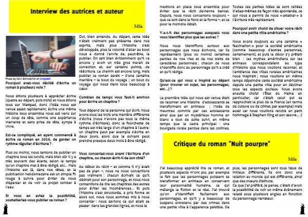 Au début du récit – et comme il n'y avait pas de plan –, nous ne nous concertions pas vraiment : chacun écrivait ce qu'il désirait pour son personnage, et nous nous contentions de lire les chapitres des autres pour éviter les incohérences... Et puis l'histoire s'est structurée, a pris forme et alors oui, nous nous sommes mis à nous concerter : nous savions ce qui allait se passer dans les grandes lignes, et nous le