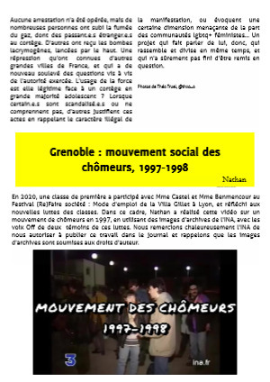En 2020, une classe de première a participé avec Mme Castel et Mme Benmencour au Festival (Re)Faire société : Mode d'emploi de la Villa Gillet à Lyon, et réfléchi aux nouvelles luttes des classes. Dans ce cadre, Nathan a réalisé cette vidéo sur un mouvement de chômeurs en 1997, en utilisant des images d'archives de l'INA, avec les voix Off de deux témoins de ces luttes. Nous remercions chaleureusement l'INA de nous autoriser à publier ce travail dans le journal et rappelons que les images d'archives sont soumises aux droits d'auteur.