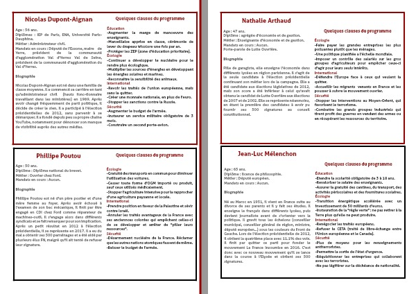Nicolas Dupont-Aignan est né dans une famille de classe moyenne. Il a commencé sa carrière en tant qu'administrateur civil (hauts fonc-tionnaire travaillant dans les ministères) en 1989. Après avoir changé fréquemment de parti politique, il décide de créer le sien. Il a participé à l'élection présidentielles de 2012, sans parvenir à se démarquer. Il a fondé depuis peu sa propre chaine YouTube, notamment pour dénoncer son manque de visibilité auprès des autres médias.