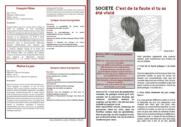 Marine Le Pen est née le 5 août 1968 à Neuilly-sur-Seine. Engagée en politique au sein du Front national, elle occupe plusieurs mandats locaux à partir de 1998 (conseillère régionale, conseillère municipale d'Hénin-Beaumont) et siège depuis 2004 au Parlement européen, où elle co-préside le groupe politique Europe des nations et des libertés (ENL). Elle est élue présidente du Front national au congrès de Tours de janvier 2011, succédant ainsi à son père, Jean-Marie Le Pen, qui dirigeait le parti depuis sa fondation. Candidate à l'élection présidentielle de 2012, elle arrive en troisième position au premier tour en obtenant 17,90 % des suffrages exprimés.