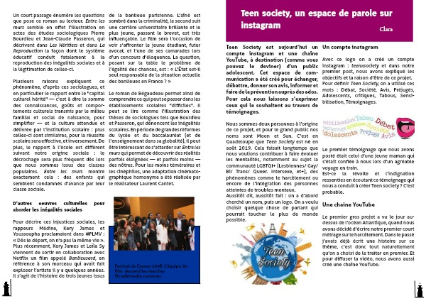 Teen Society est aujourd’hui un compte instagram et une chaîne YouTube, à destination (comme vous pouvez le deviner) d'un public adolescent. Cet espace de com-munication a été créé pour échanger, débattre, donner son avis, informer et faire de la prévention auprès des ados. Pour cela nous laissons s’exprimer ceux qui le souhaitent au travers de témoignages.