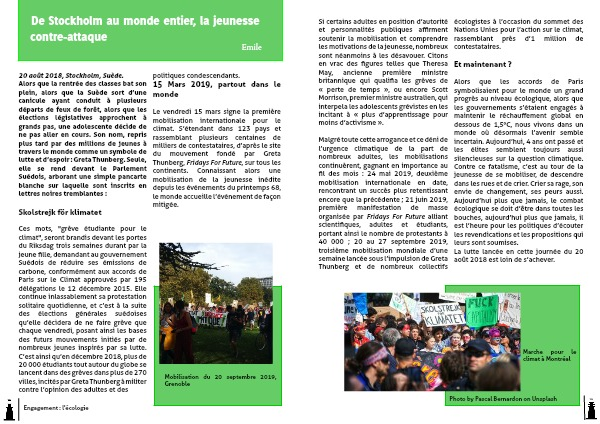 Alors que les accords de Paris symbolisaient pour le monde un grand progrès au niveau écologique, alors que les gouvernements s’étaient engagés à maintenir le réchauffement global en dessous de 1,5°C, nous vivons dans un monde où désormais l’avenir semble incertain. Aujourd’hui, 4 ans ont passé et les élites semblent toujours aussi silencieuses sur la question climatique. Contre ce fatalisme, c’est au tour de la jeunesse de se mobiliser, de descendre dans les rues et de crier. Crier sa rage, son envie de changement, ses peurs aussi. Aujourd’hui plus que jamais, le combat écologique se doit d’être dans toutes les bouches, aujourd’hui plus que jamais, il est l’heure pour les politiques d’écouter les revendications et les propositions qui leurs sont soumises.